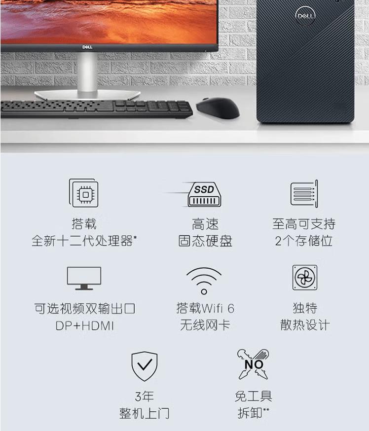 戴爾(DELL)靈越3910-18N6家用辦公學(xué)習(xí)網(wǎng)課娛樂臺式電腦主機12代i5 16G 256G+1T獨顯 加27英寸全高清顯示器(S2721NX)